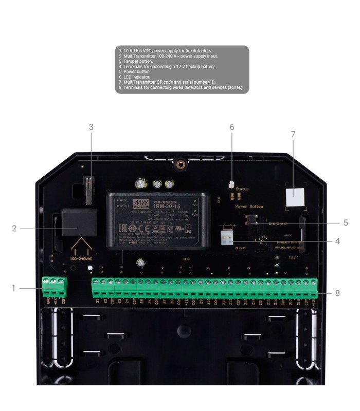 | Entradas cableadas | Hasta 18 (Intrusión, Incendio, Ayuda médica, Botón de pánico, Alarma de gas, Alarma antisabotaje, Fallo de funcionamiento, Inundación, Personalizada) |