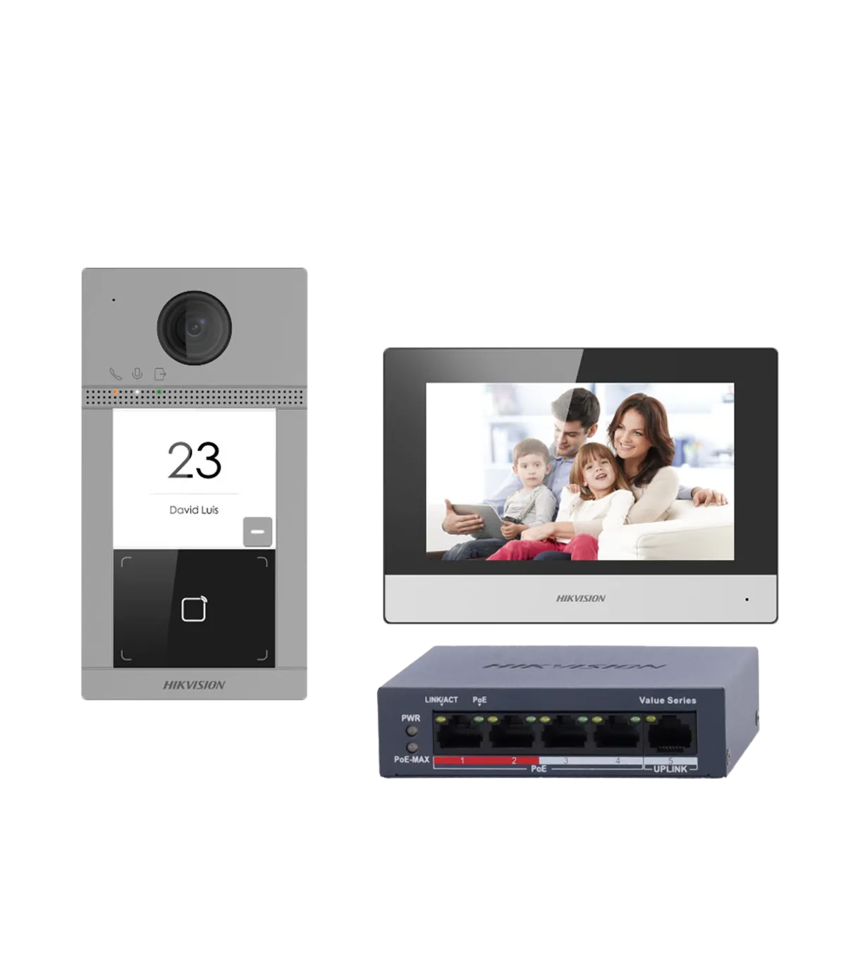 • Kit formado por: DS-KV8113-WME1(C) placa exterior de videoportero para superficie con cámara de 2 Mpx HD, DS-KH6320-WTE1 monitor interior WiFi con pantalla TFT LCD de 7" y switch PoE estándar