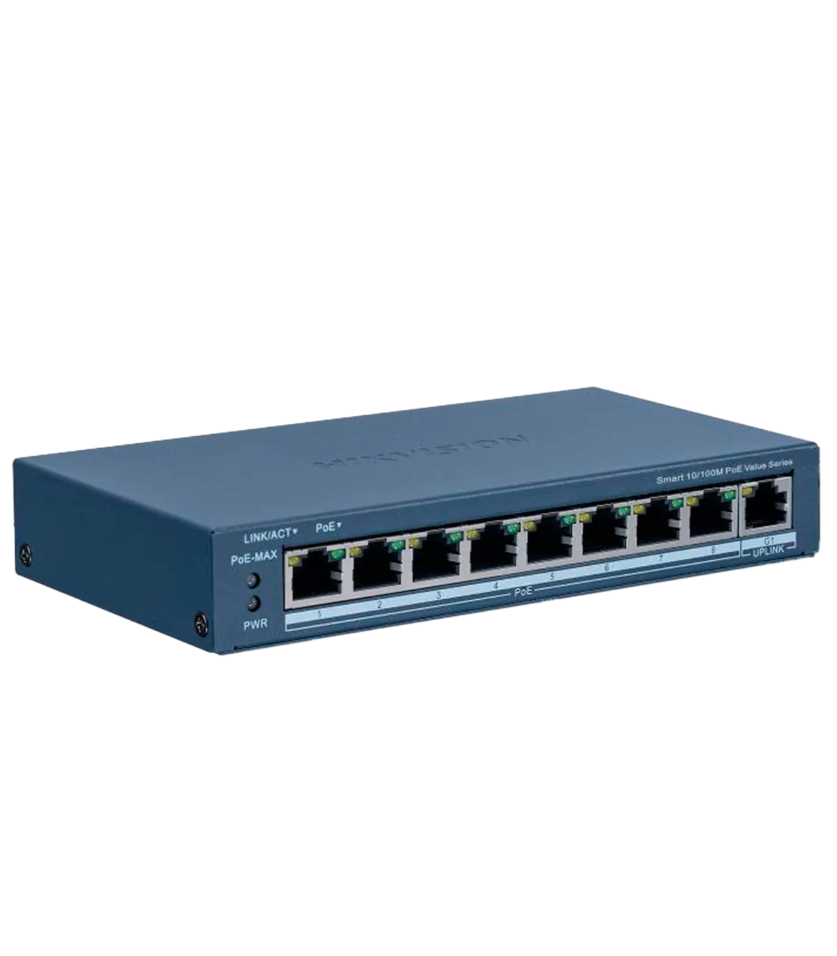 - 8 puertos PoE+ RJ45 10/100 Mbps + 1 Uplink 10/100/1000 Mbps