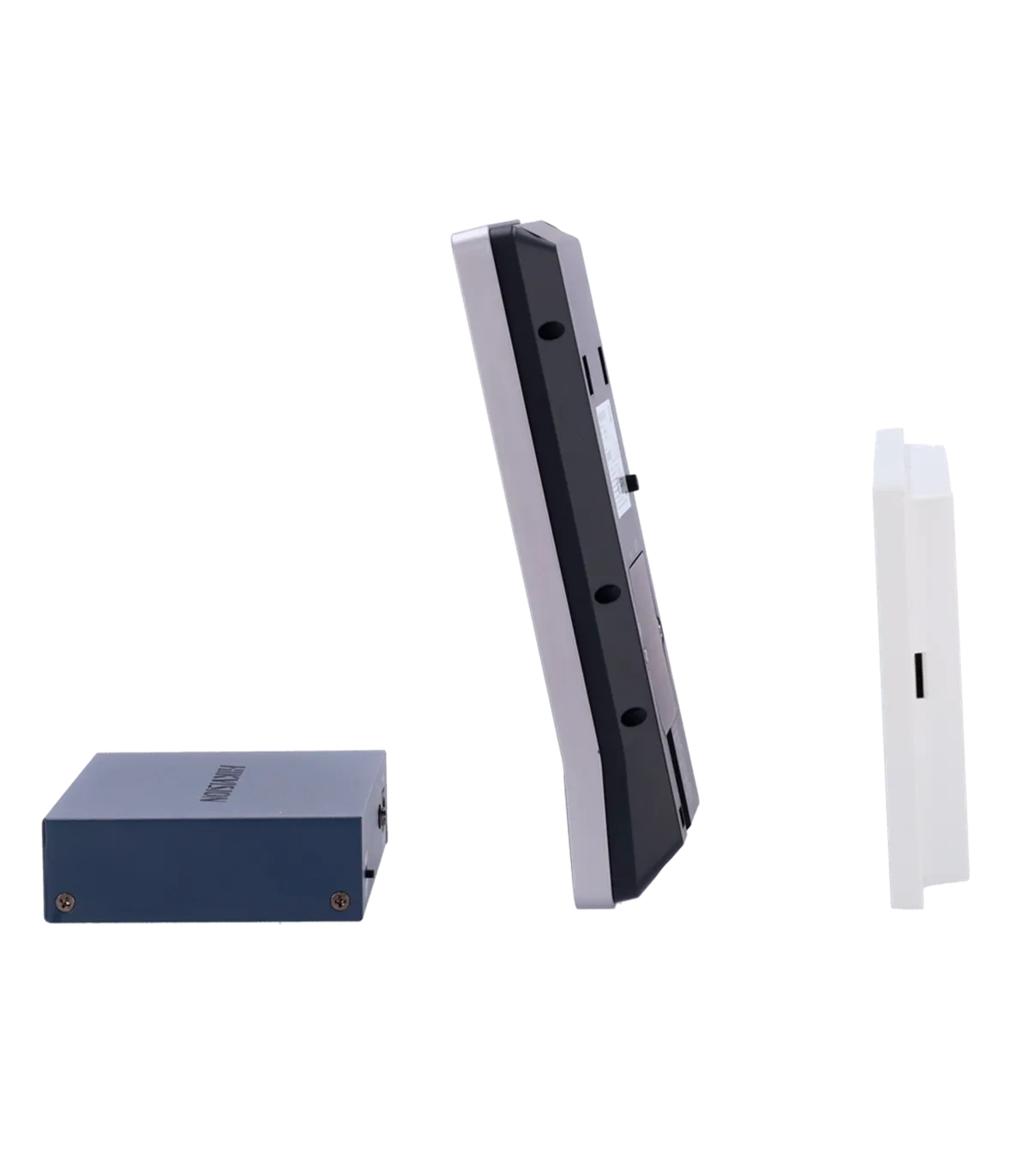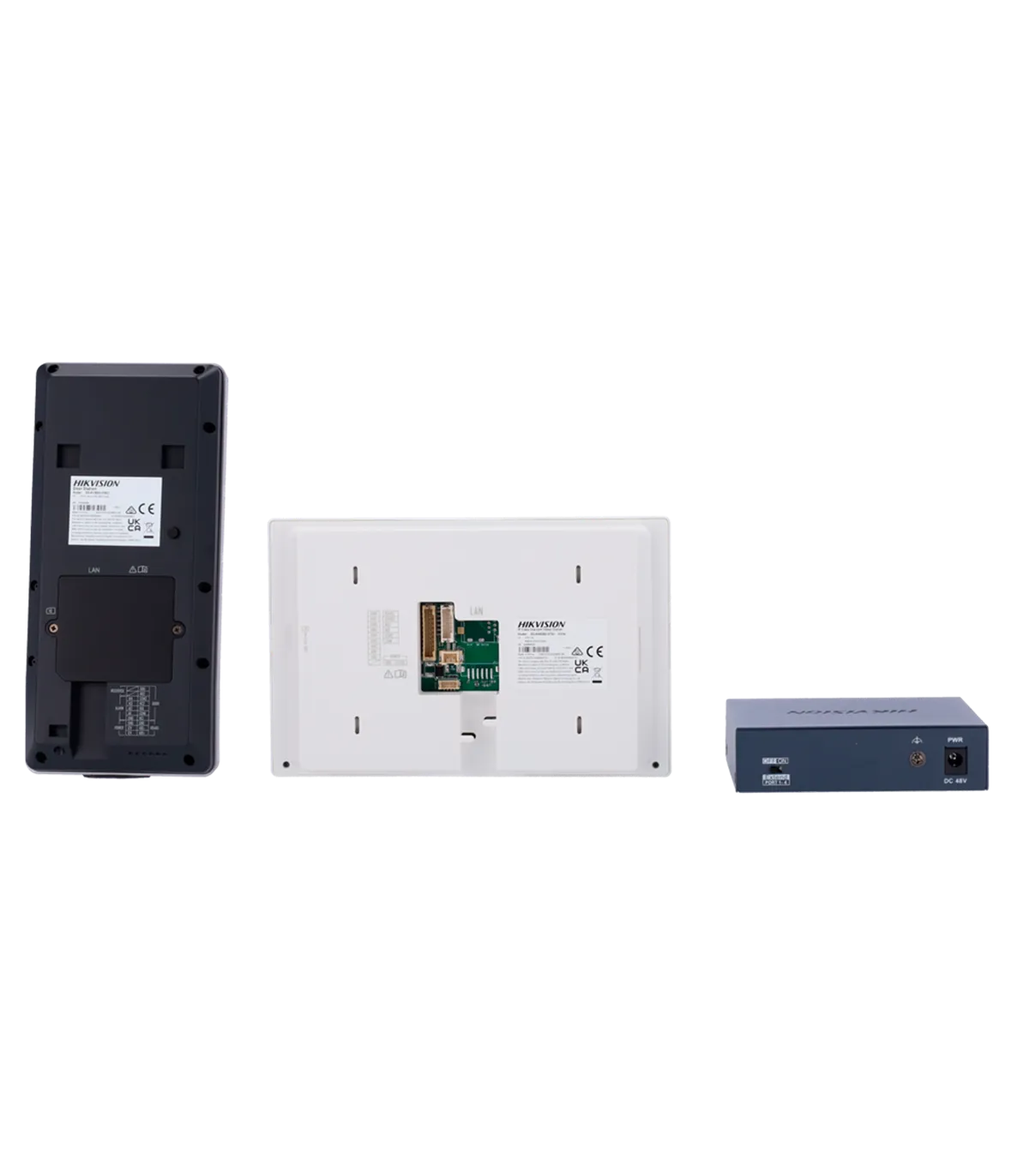 • Kit composto por: placa externa de videoporteiro DS-KV9503-WBE1 com reconhecimento facial e botão físico de chamada, monitor interno WiFi DS-KH6350-WTE1 com tela TFT LCD de 7" e moldura estreita e switch PoE padrão